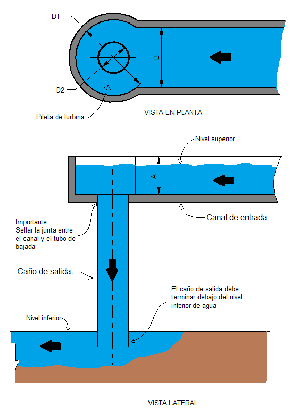 El factor clave en este diseño es la altura H. Esta distancia vertical representa el «salto de agua» o caída neta entre el nivel del agua en la pileta y el nivel de restitución al final del caño de salida.